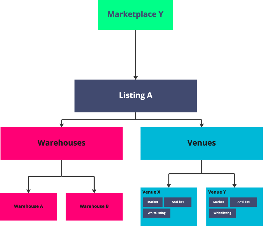 By having multiple warehouses and venues, listings can create bespoke sale strategies such as tiered sales. An example of this would be a Gaming NFT Creator separating the sale based on NFT rarity and emitting whitelist tokens to different users for different rarities depending on the user’s game score.